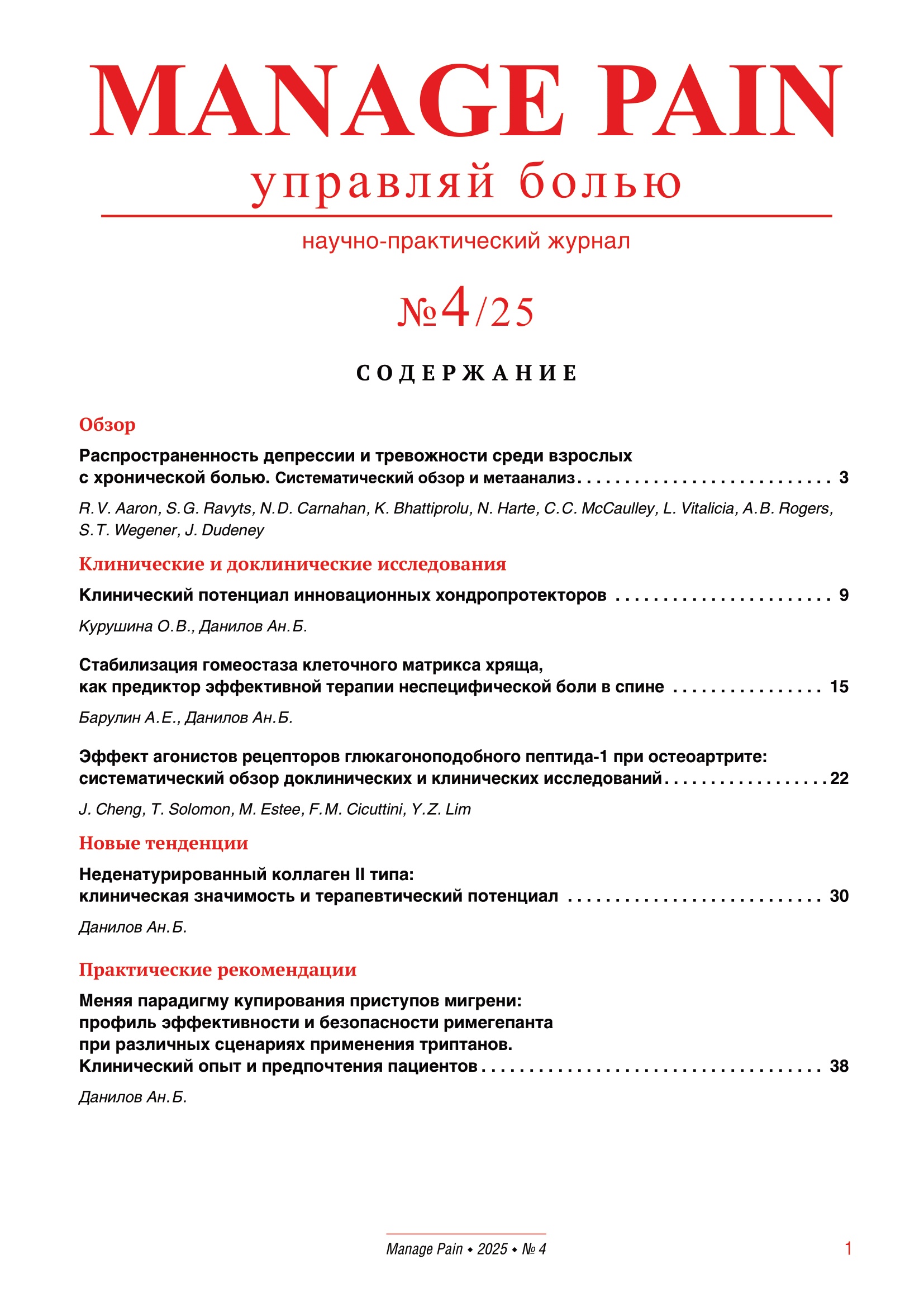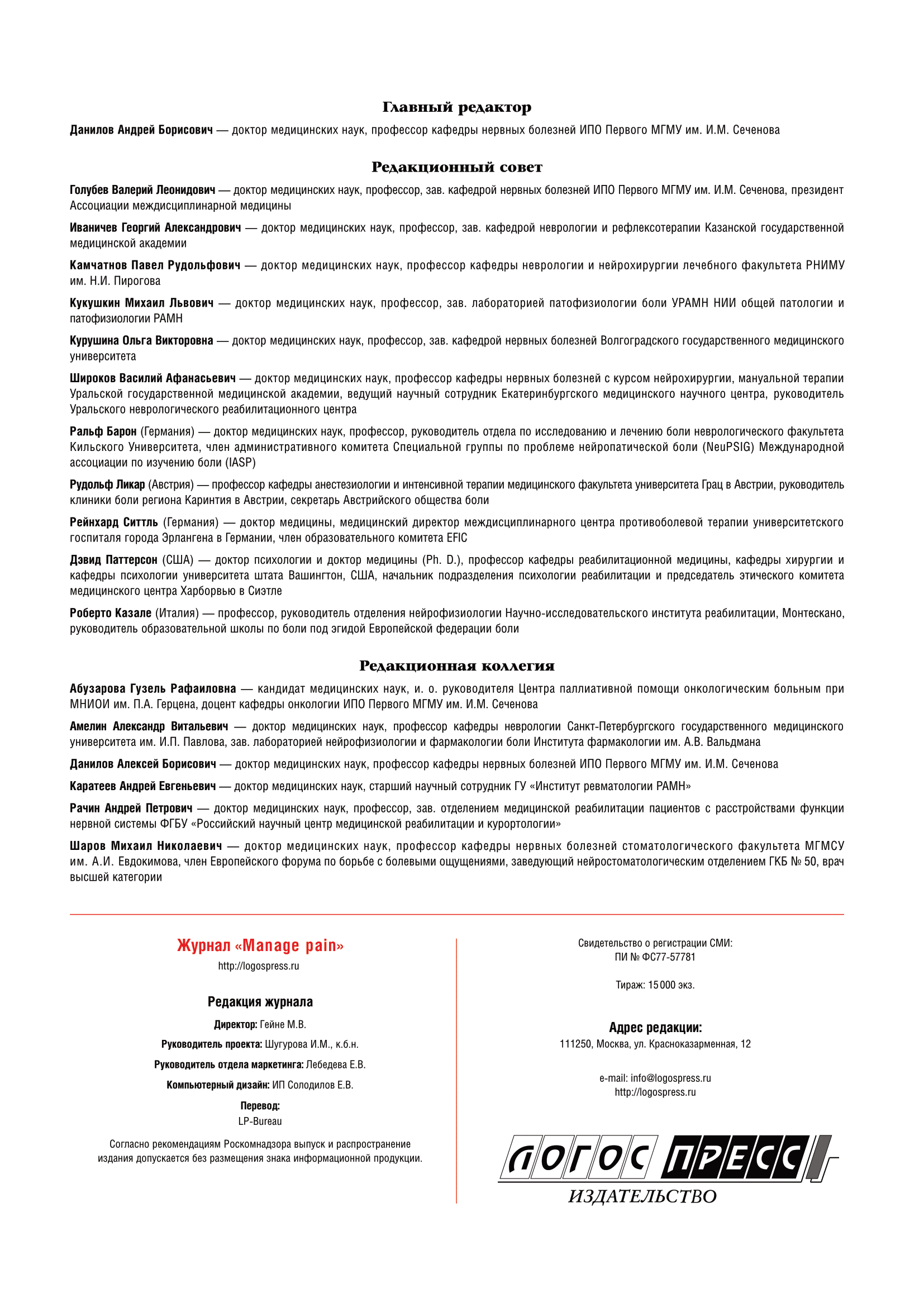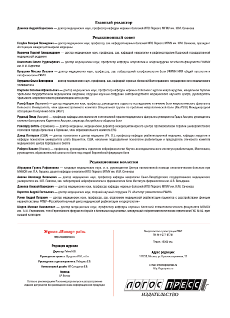В основе формирования содержания лежит биопсихосоциальная концепция боли. Manage Pain (Управляй болью) — это научно-практическое издание для неврологов, терапевтов, анестезиологов, психиатров, психологов, врачей смежных специальностей.